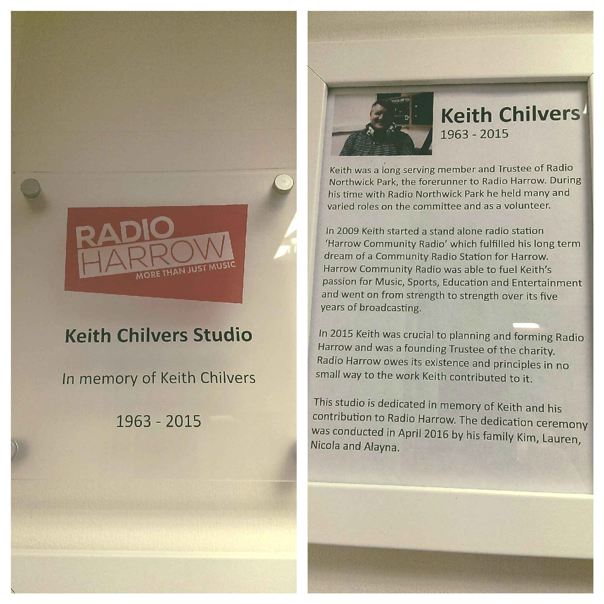 Keith’s wife and daughters unveiled the new plaque renaming the studio. Upon seeing the plaque, Kim Chilvers said “Keith would have been proud as punch to receive this honour at the station. He truly loved Radio Harrow and he would have been so excited and honoured to receive this”.